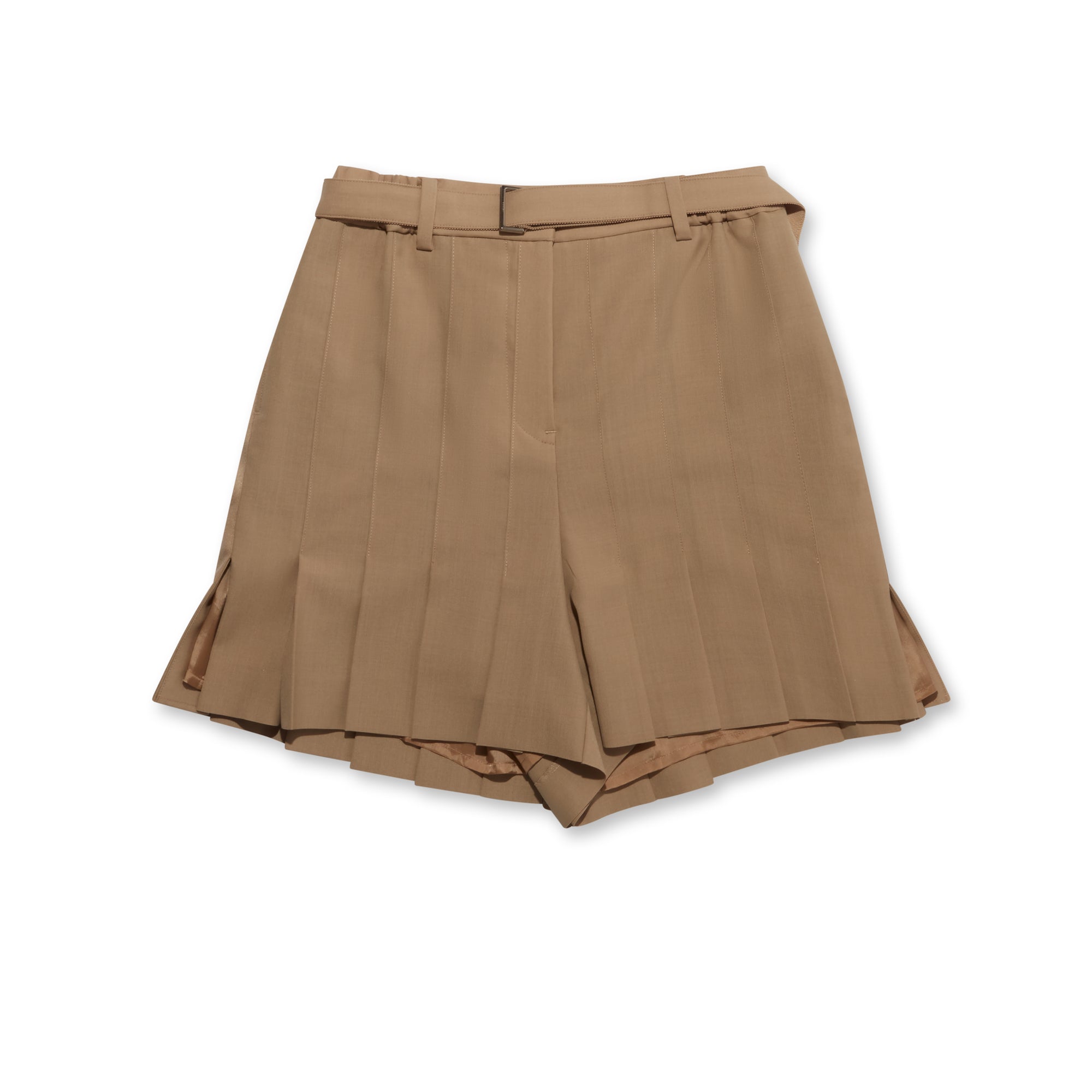 ThesesacaiWomen's suiting shorts are characterised byknife pleats throughout the design.Rendered in a wool-blend, the style featuresa mid-rise withadetachableslide-buckle belt, four pocket construction and splits to the outer hem. The shorts are finished with tonal grosgrain detailingand a cupro lining.