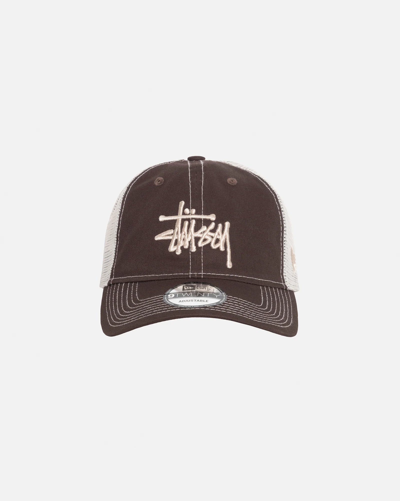 Fitted New Era 9TWENTY six panel trucker cap in cotton twill. Stüssy basic stock logo embroidery.