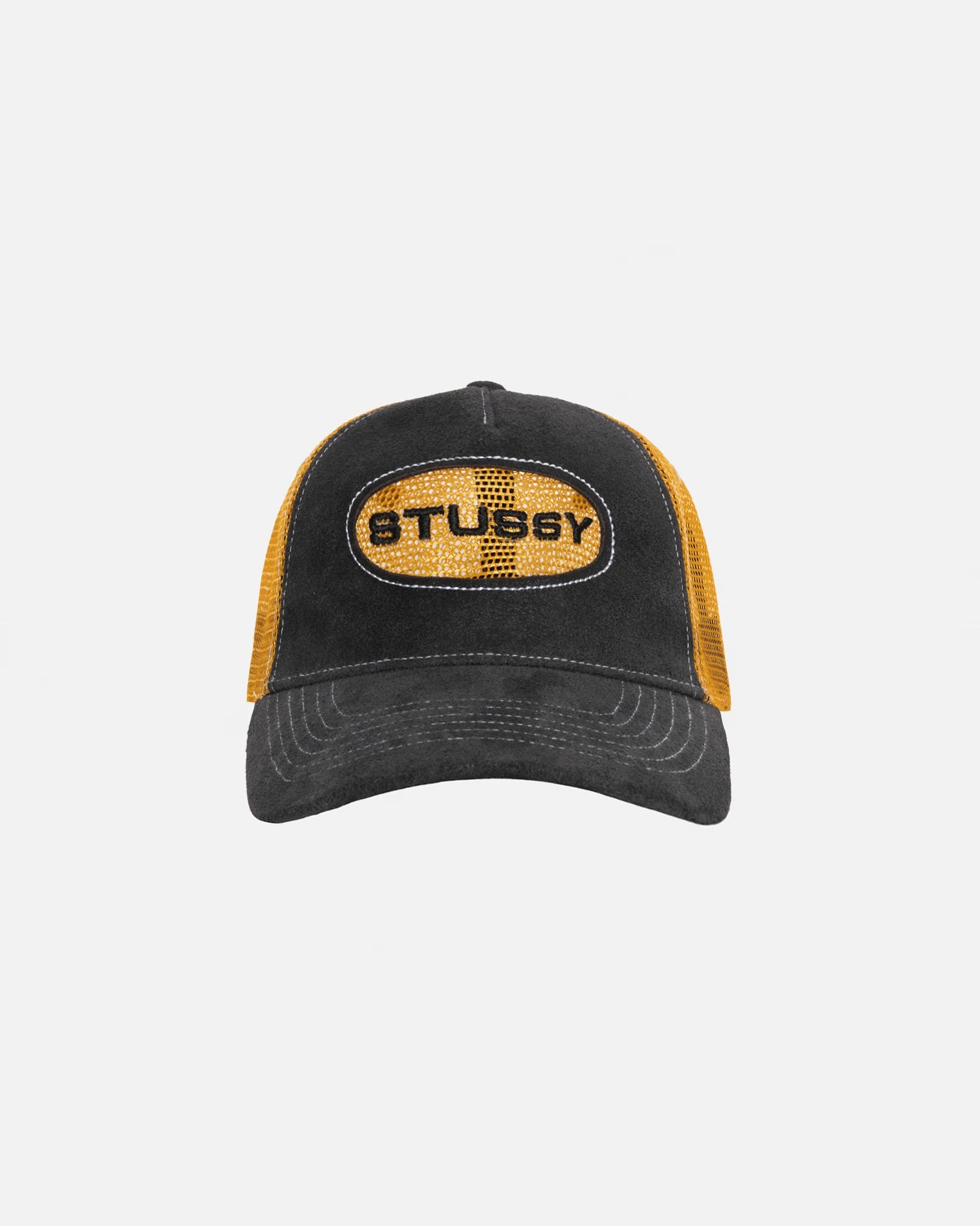 Low profile five panel trucker cap in distressed leather. Mesh cut out with Stüssy logo embroidery at the crown.