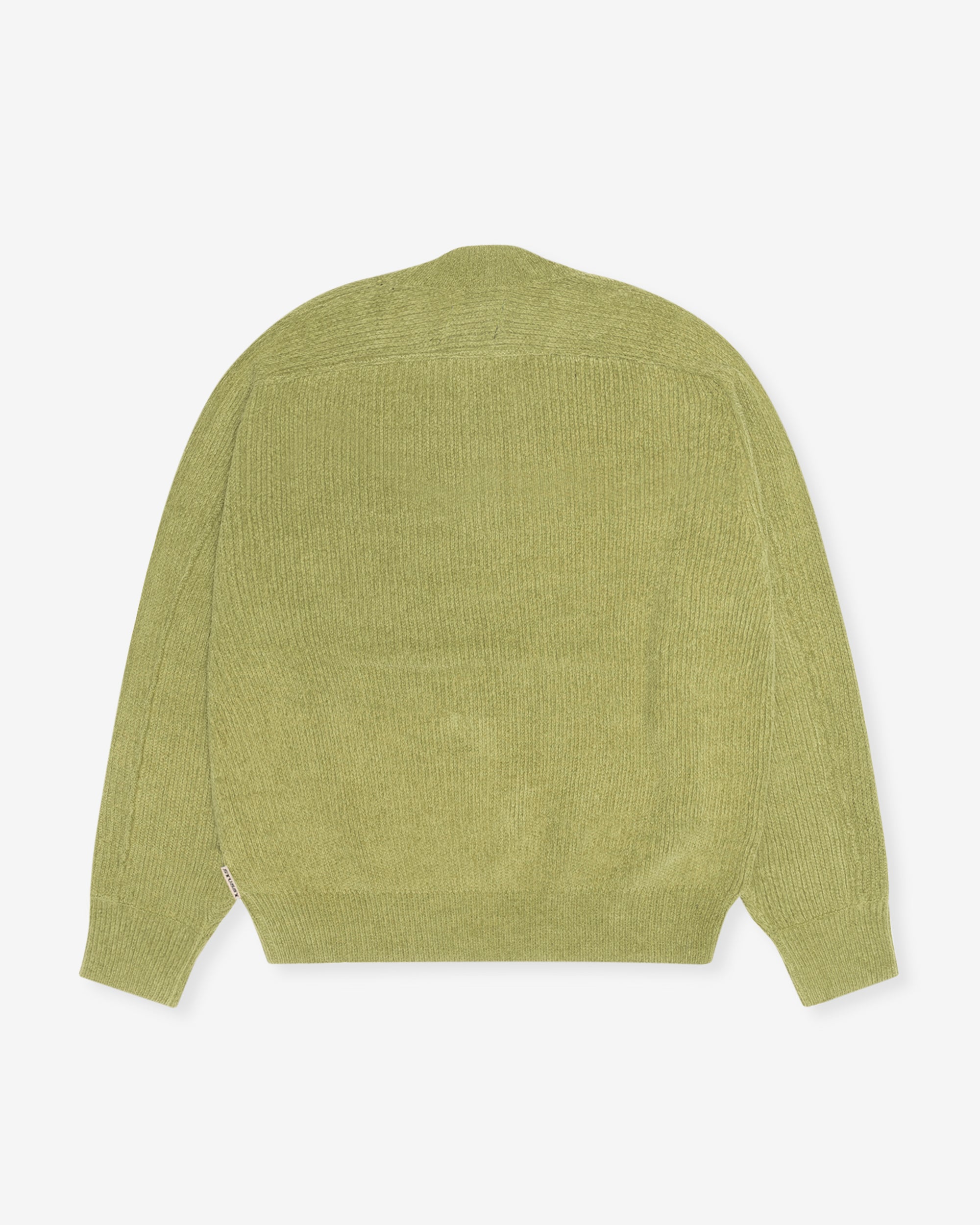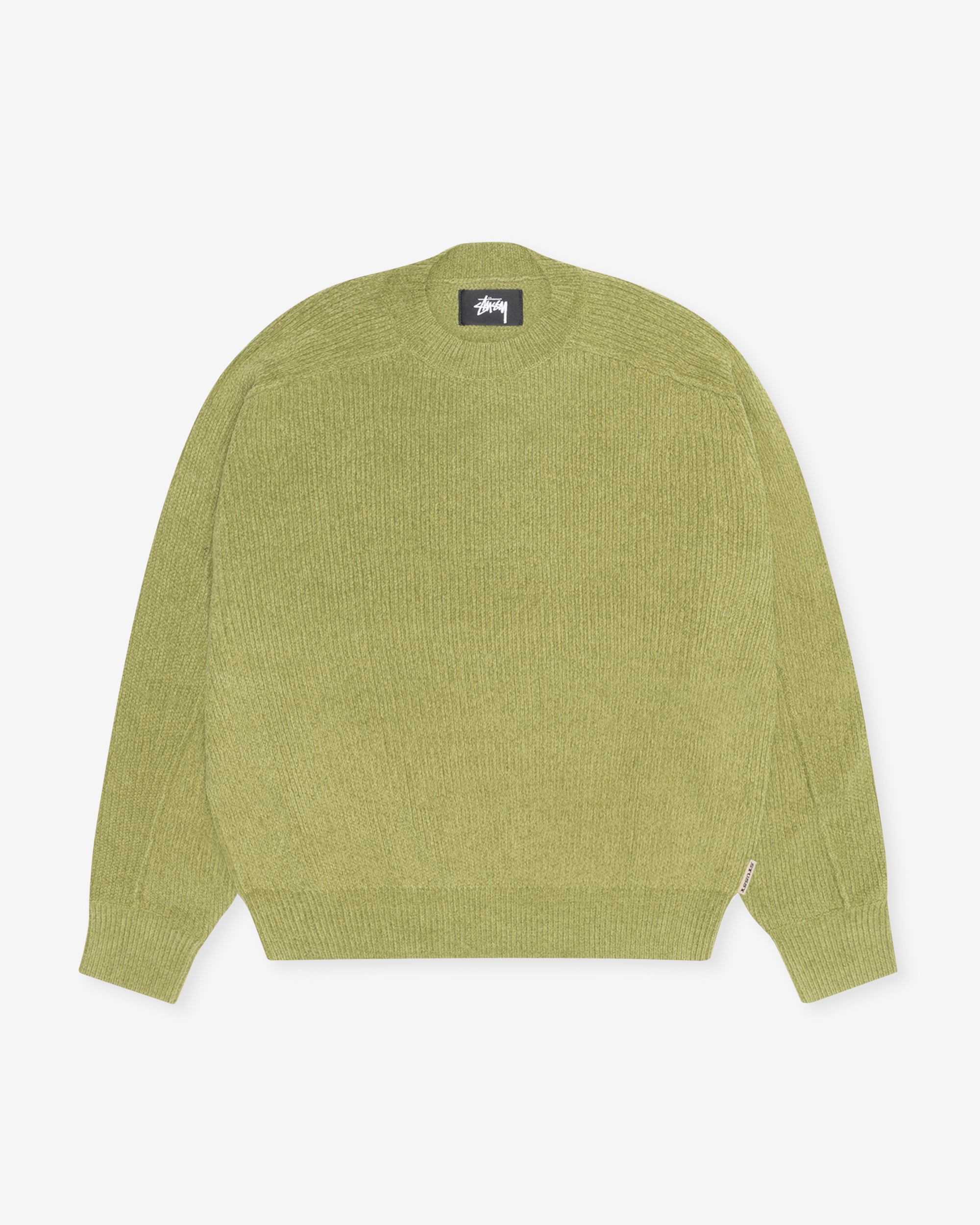 Relaxed fit crewneck sweater with exposed seamsMidweight cotton chenille5-gauge knitRibbed neckline, cuffs and hemRaglan sleeveStüssy big serif flag label at side seam