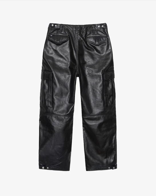 Relaxed cargo pant in leather. Features a slightly articulated knee shape and snap adjusters at the waistband and hem. Stüssy swirly “S” embossed above the right rear pocket.