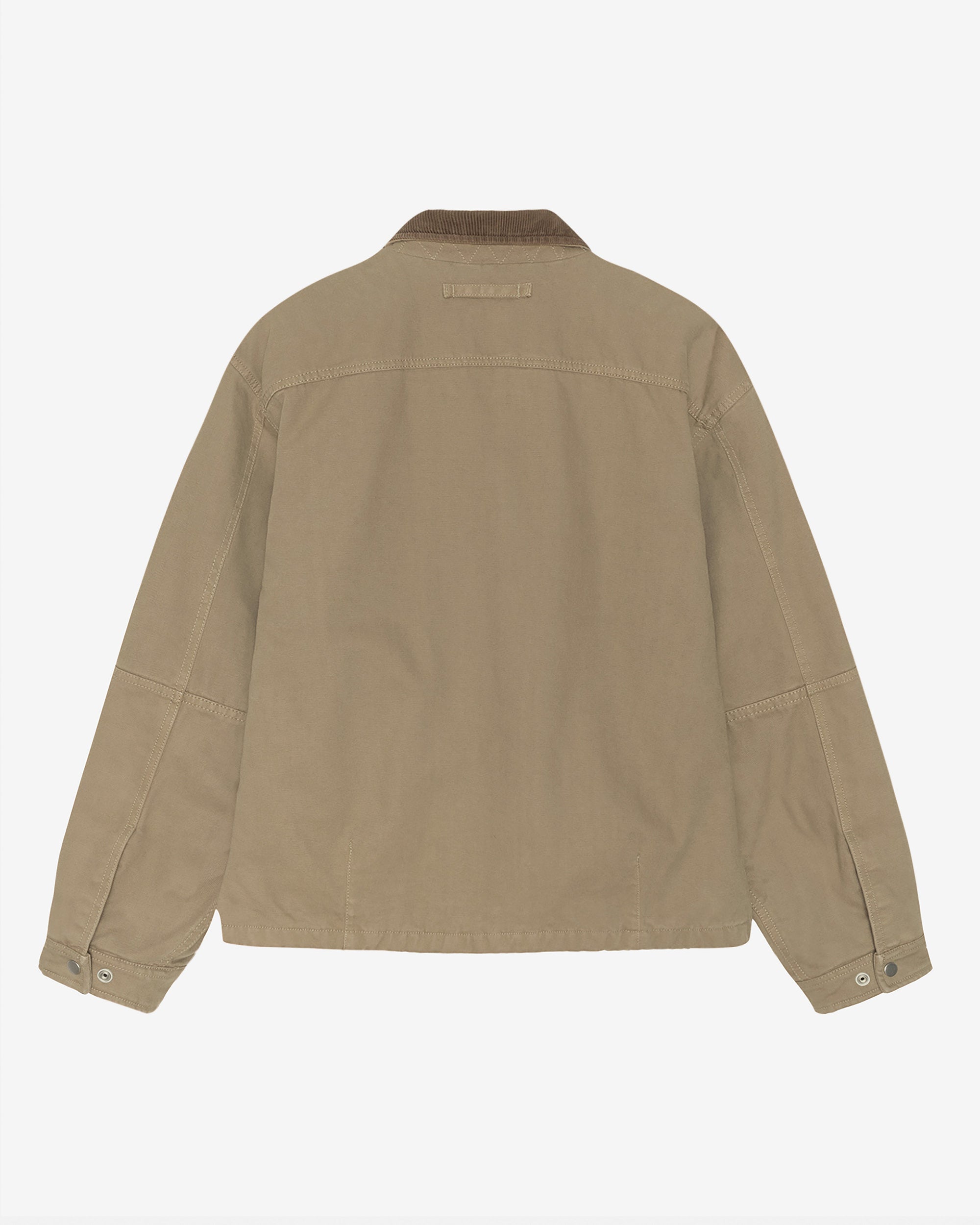 Work jacket in cotton canvas lined with quilted lining. Boxy fit featuring a corduroy collar, concealed zip closure, patch pockets, and a garment dye with stonewash treatment. Stüssy workgear label stitched at the side.