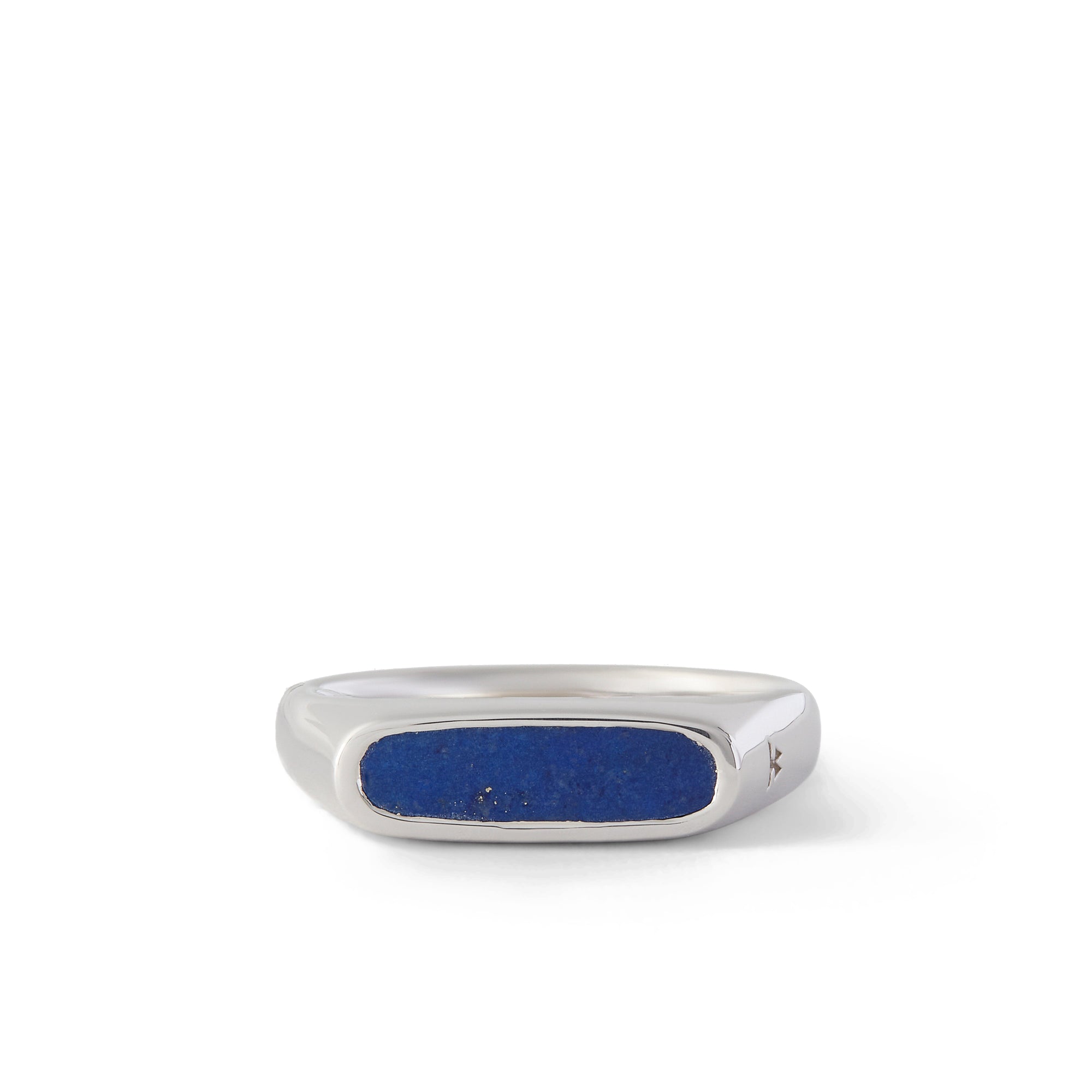 A slim signet ring with a custom hand cut and bezel set blue Lapis stone on top.